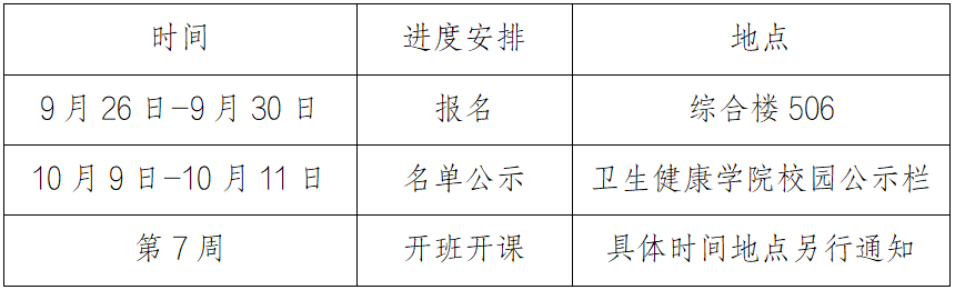 2.报名方式:学生自行填写《东莞职业技术学院智慧养老微专业报名表》,提交到卫生健康学院综合楼506教研办公室陈韵珊老师处(原在班级已预报名的学生也需要提交报名表)。进度安排如下: