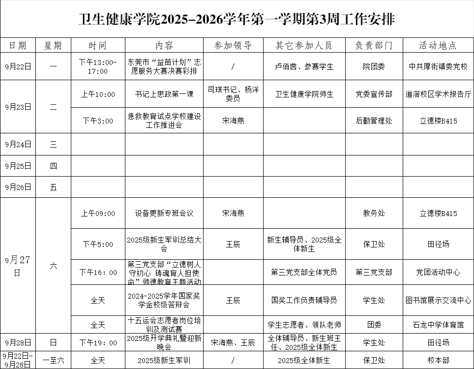 卫生健康学院2025-2026学年第一学期第3周工作安排