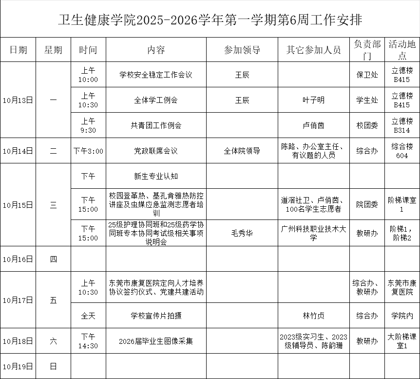 卫生健康学院2025-2026学年第一学期第6周工作安排