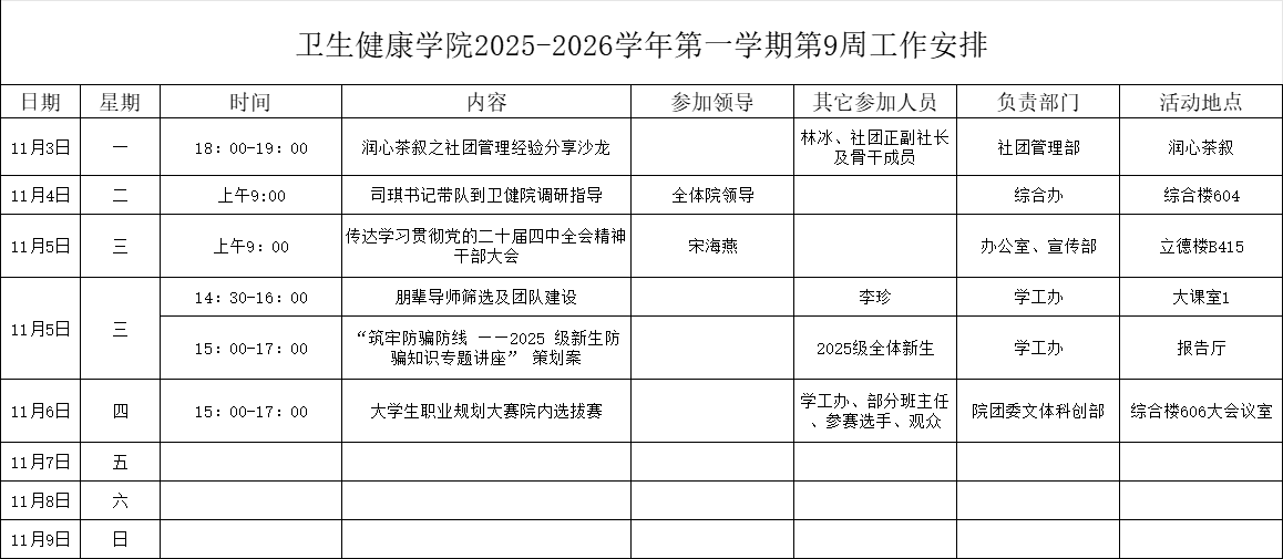 卫生健康学院2025-2026学年第一学期第9周工作安排