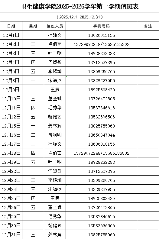 卫生健康学院2025-2026学年第一学期值班表(12月)