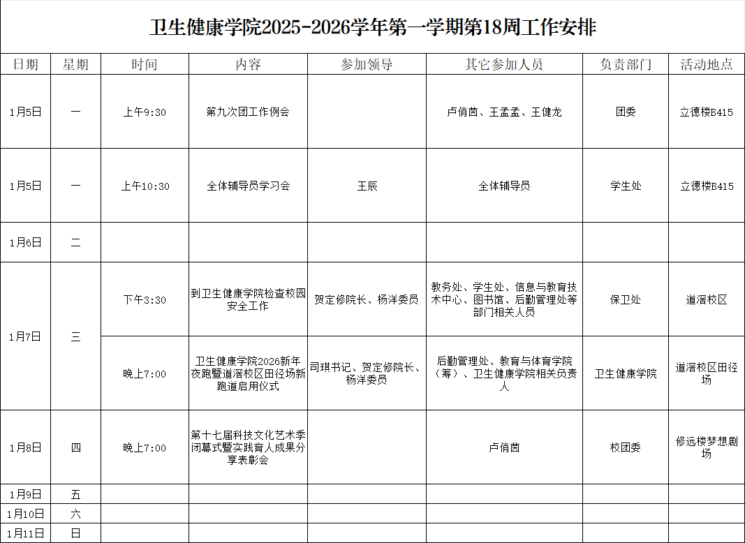 卫生健康学院2025-2026学年第一学期第18周工作安排