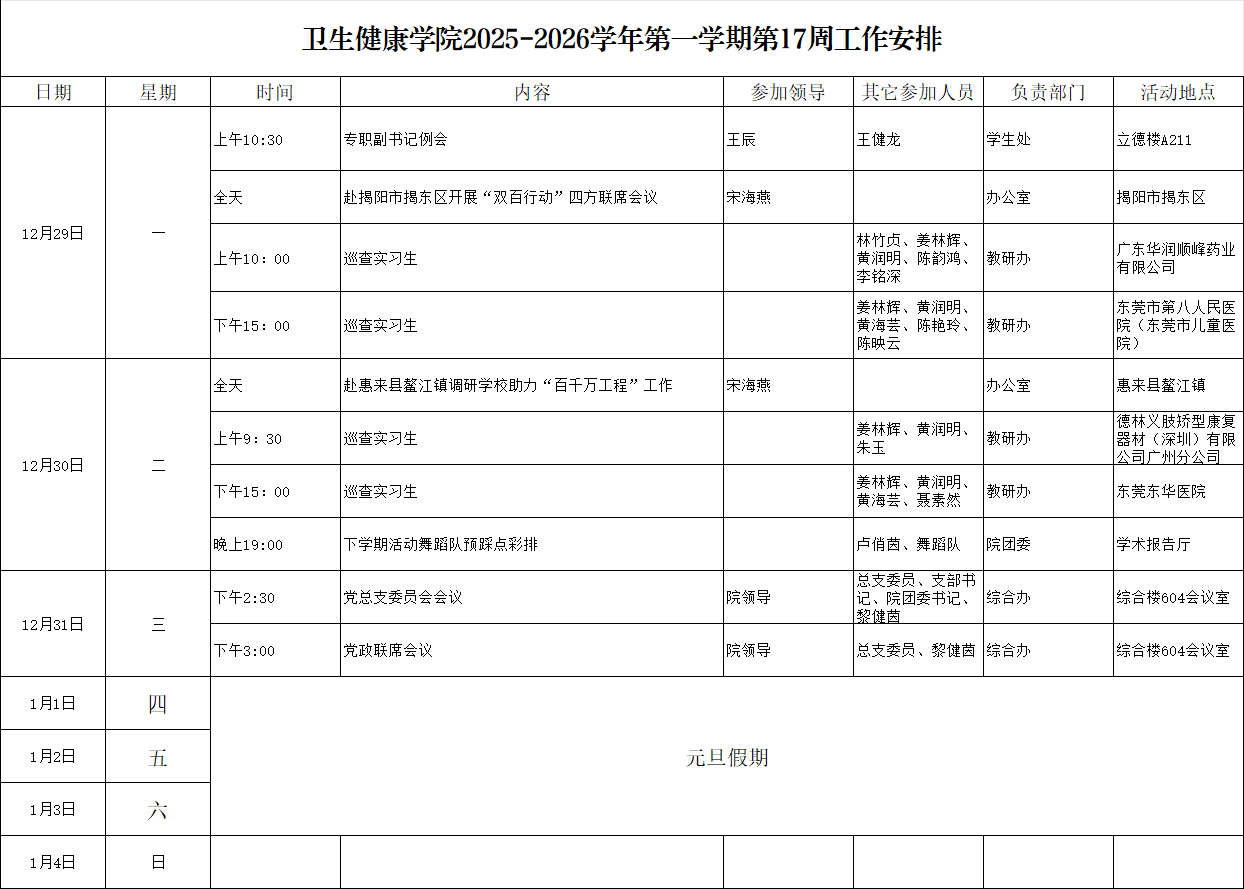卫生健康学院2025-2026学年第一学期第17周工作安排