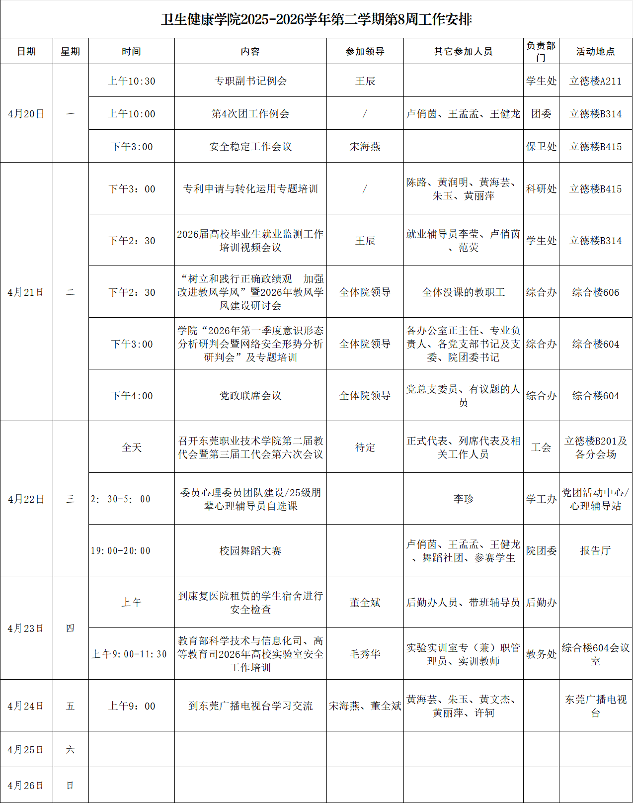 卫生健康学院2025-2026学年第二学期第8周工作安排