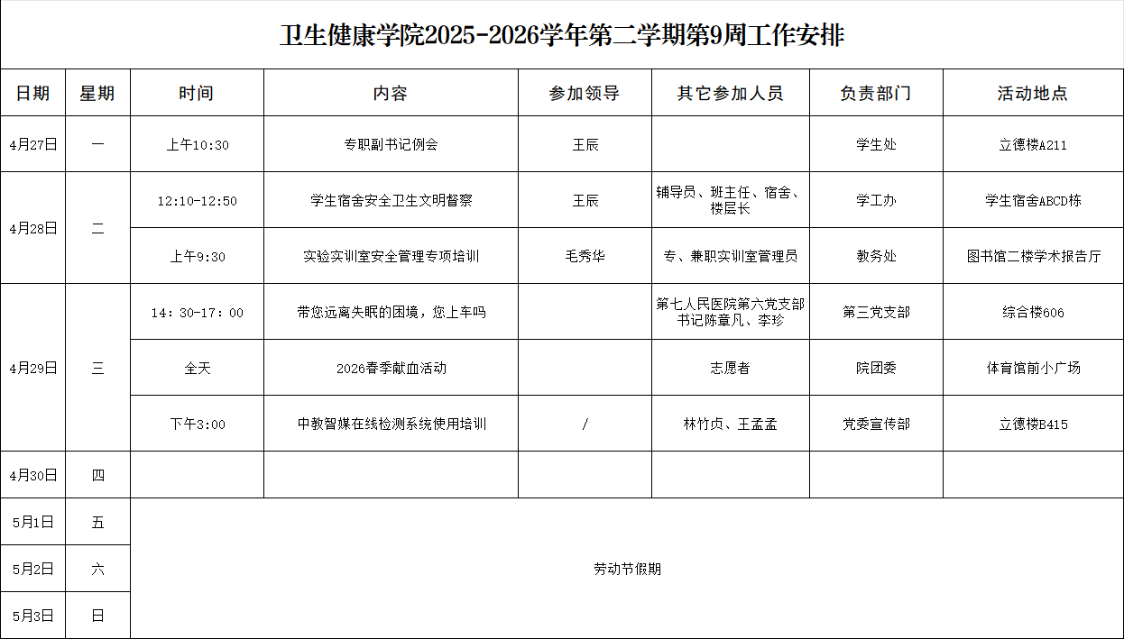 卫生健康学院2025-2026学年第二学期第9周工作安排