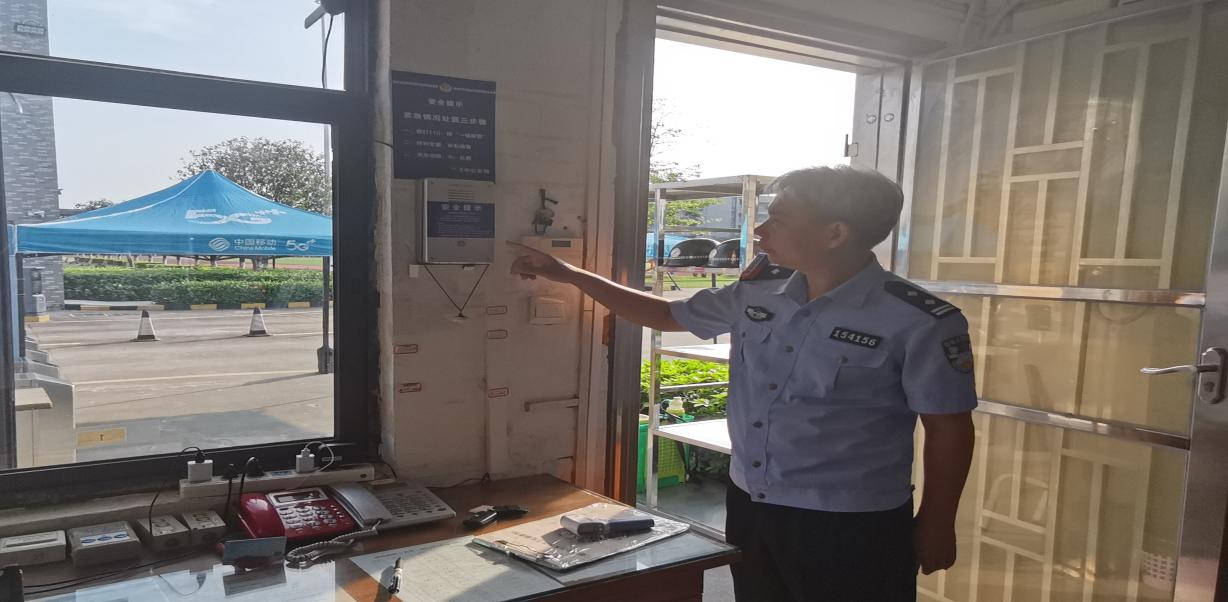 黄丽水警长对大门岗的“一键报警”、对讲机等装置进行检查