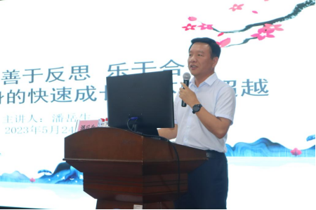 之后,原岳阳职业技术学院院长潘岳生教授,为老师们主讲题为“勤于学习、善于反思、乐于合作、努力实现自身的快速成长和不断超越”的讲座。潘岳生教授结合自身经历、引经据典,分别从“勤于学习——站在前人的肩膀上前行”、“善于反思——站在自己的阶梯上攀升”、“乐于合作站在团队的翅膀上翱翔”三个方面阐述如何突破自我,不断成长。潘教授尤其鼓励年轻老师们要保持终身学习的习惯,有勇于挑战自己的决心和行动,才能不断成长,在工作中有所作为。潘教授以生动平实的语言分享自己学习的见解,对学院老师们颇有启发,点燃了老师们奋发向上、争先创优的热情。
