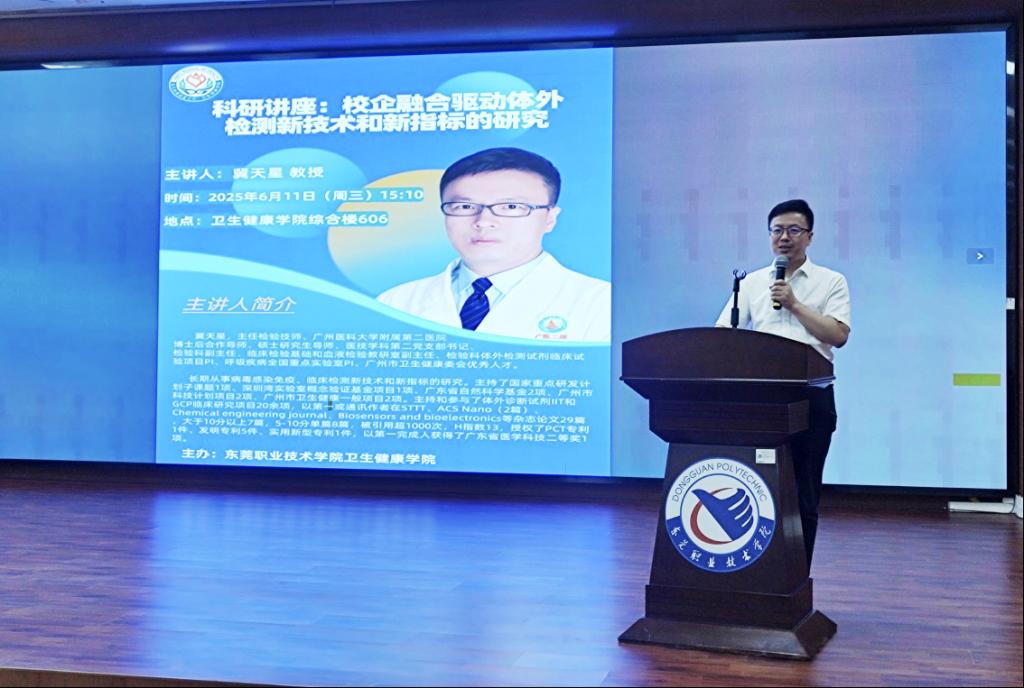 为提升我院教师科研能力,营造良好学术氛围,6月11日下午,学院特邀广州医科大学附属第二医院检验科副主任、博士后合作导师、硕士研究生导师冀天星教授作“校企融合驱动体外检测新技术和新指标的研究”专题学术讲座。讲座由学院副院长毛秀华主持,全体专任教师及辅导员参加。