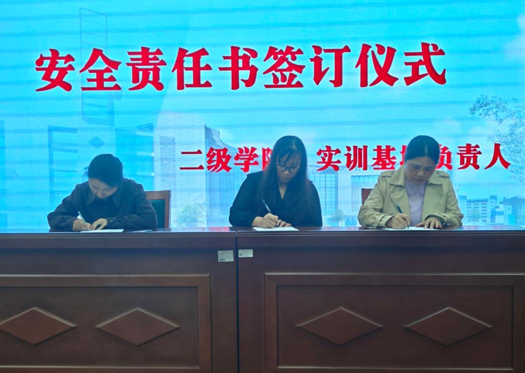 会上,毛秀华副院长结合我院实验实训室安全管理实际,系统解析了三级安全管理责任体系的具体内容,进一步明确了从学院领导到一线教师在安全管理中的岗位职责。她重点强调了课前安全教育、课中安全监督、课后隐患排查以及事故应急处置等关键环节,要求全体教师将安全意识内化于心、外化于行。随后,毛秀华副院长代表学院与各实训基地负责人逐一签订《实验实训室安全责任书》,将安全责任逐级分解、落实到人,形成“层层负责、人人有责”的安全管理格局。