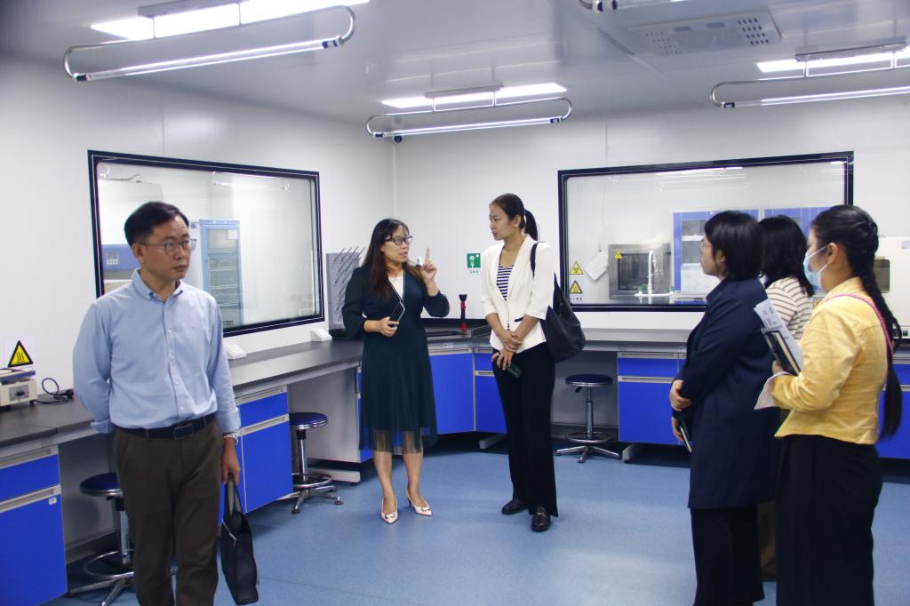 在毛秀华副院长的陪同下,王洋副校长一行实地考察了理实虚一体实训室、康复实训室、生命科学馆、P2实训室、用药安全平台、固体制剂GMP模拟车间、药用植物园及心理咨询室等场所,全面了解了学院在实践教学条件与专业建设方面的具体举措与成效,并给予高度评价。
