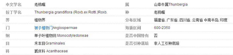 缠绕木质藤本,茎粗壮,长达7米以上,单叶对生,阔卵形,具3-5条掌状脉,叶缘有缺刻或浅裂,两面粗糙,被毛,叶柄无翼,花大,腋生,数朵成下垂总状花序,叶状苞片2枚,初合生,后一侧开裂成佛焰状苞状,有微毛,花萼退化,花冠漏斗状,初开蓝色,以后色渐浅,末花时近白色。花期5-11月,蒴果下部近球形,上部具长喙,开裂时似乌鸦嘴。