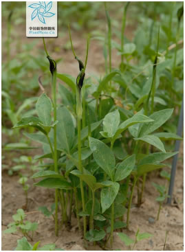 块茎圆球形,直径1-2厘米,具须根。叶2-5枚,有时1枚。叶柄长15-20厘米,基部具鞘,鞘内、鞘部以上或叶片基部(叶柄顶头)有直径3-5毫米的珠芽,珠芽在母株上萌发或落地后萌发;幼苗叶片卵状心形至戟形,为全缘单叶,长2-3厘米,宽2-2.5厘米;老株叶片3全裂,裂片绿色,背淡,长圆状椭圆形或披针形,两头锐尖,中裂片长3-10厘米,宽1-3厘米;侧裂片稍短;全缘或具不明显的浅波状圆齿,侧脉8-10对,细弱,细脉网状,密集,集合脉2圈。花序柄长25-30(-35)厘米,长于叶柄。佛焰苞绿色或绿白色,管部狭圆柱形,长1.5-2厘米;檐部长圆形,绿色,有时边缘青紫色,长4-5厘米,宽1.5厘米,钝或锐尖。肉穗花序:雌花序长2厘米,雄花序长5-7毫米,其中间隔3毫米;附属器绿色变青紫色,长6-10厘米,直立,有时“S”形弯曲。浆果卵圆形,黄绿色,先端渐狭为明显的花柱。花期5-7月,果8月成熟。