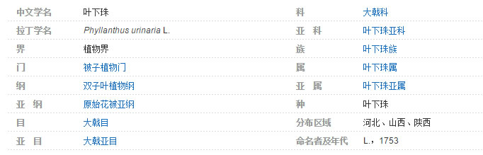 叶下珠(学名:Phyllanthus urinaria L.),别名: 珠仔草、假油甘、潮汕、龙珠草、企枝叶下珠,碧凉草等。
